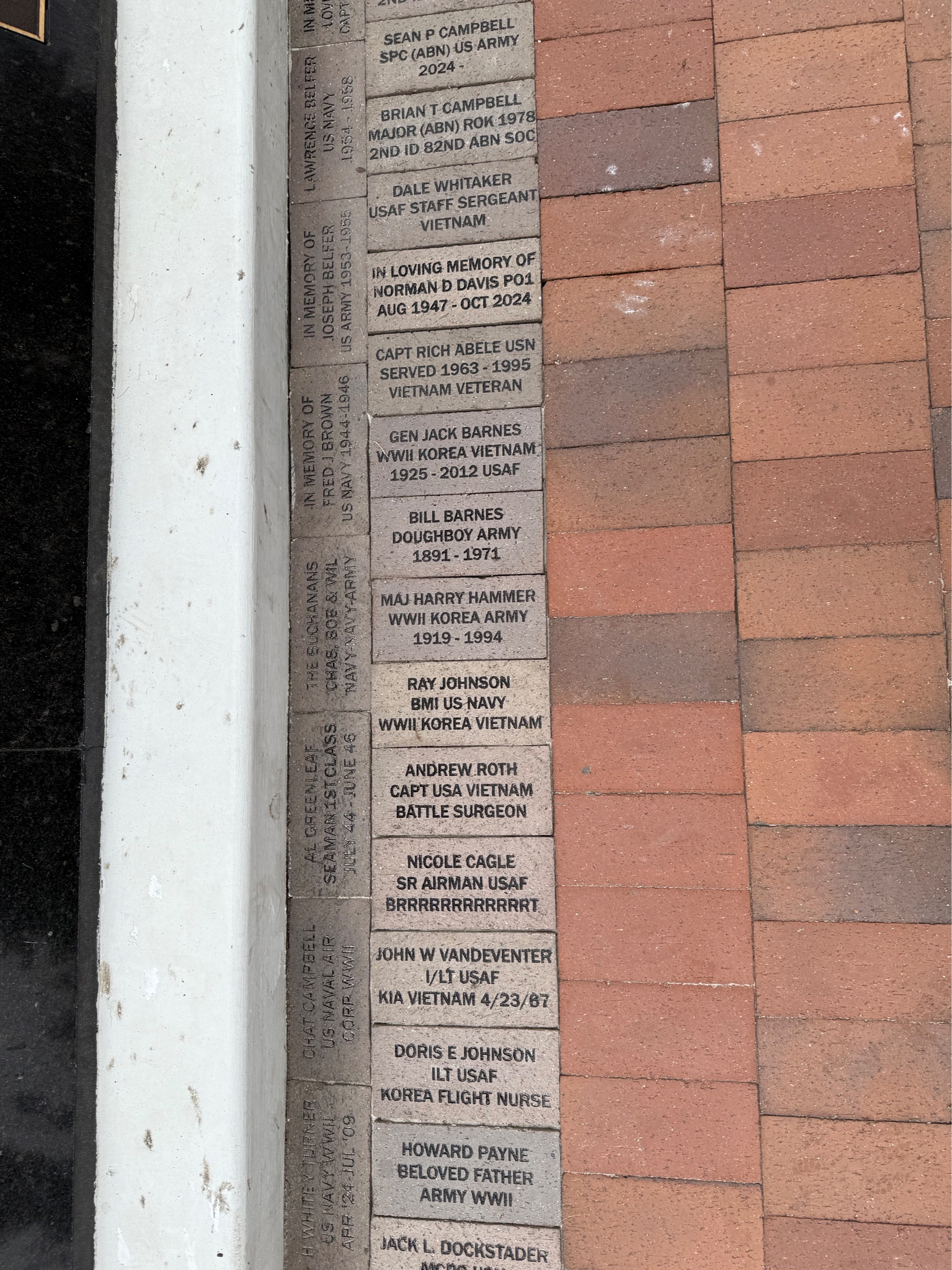 Each brick is unique and includes all different types of information.  Check out our website www.RBVeteransMemorial.com/Memorial-Bricks for some examples.